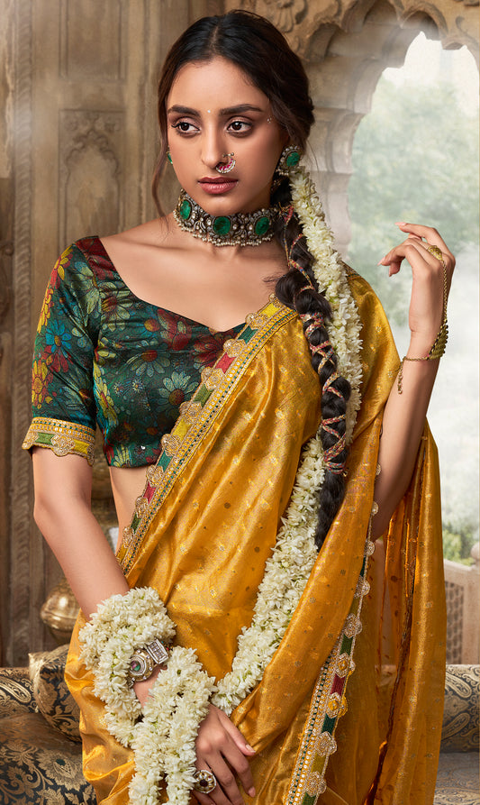 Yellow Color Designer Banarasi Tissue Silk Readymade/Easy Saree