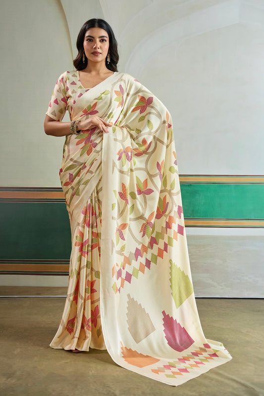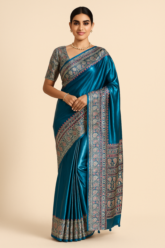 Turquoise Readymade Crepe Ajrakh Silk Saree