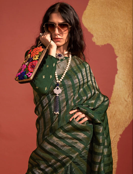 Bottle Green Color Banarasi Silk Readymade/Easy Saree