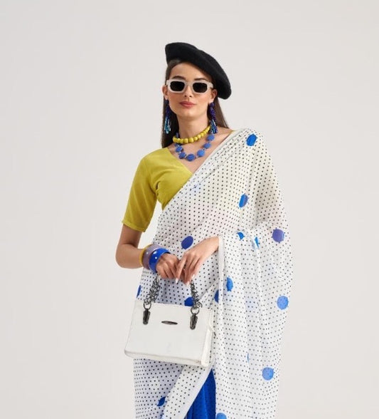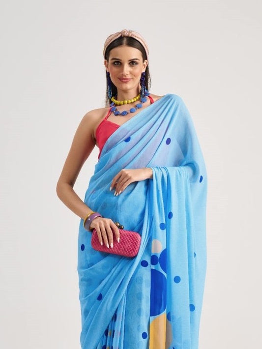 Blue Polka Dot Georgette Readymade/Easy Saree