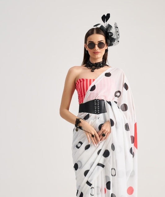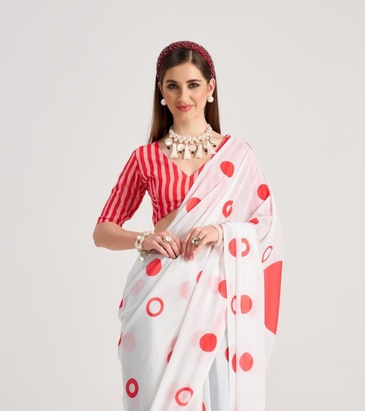 White & Red Polka Dot Georgette Readymade/Easy Saree