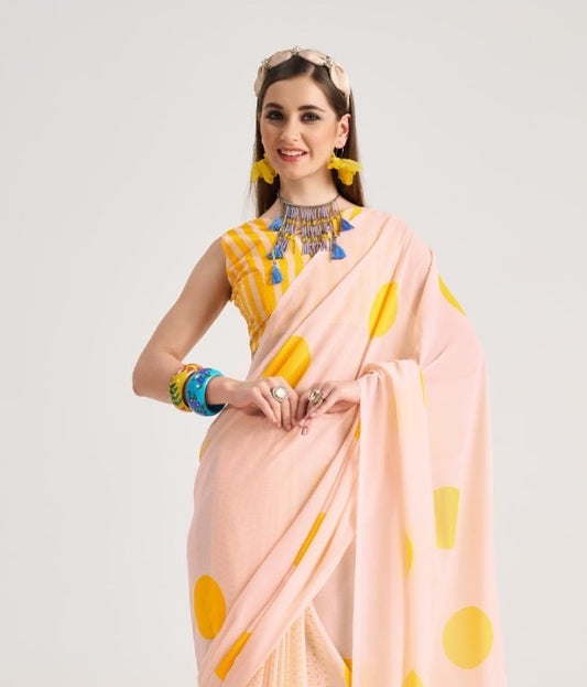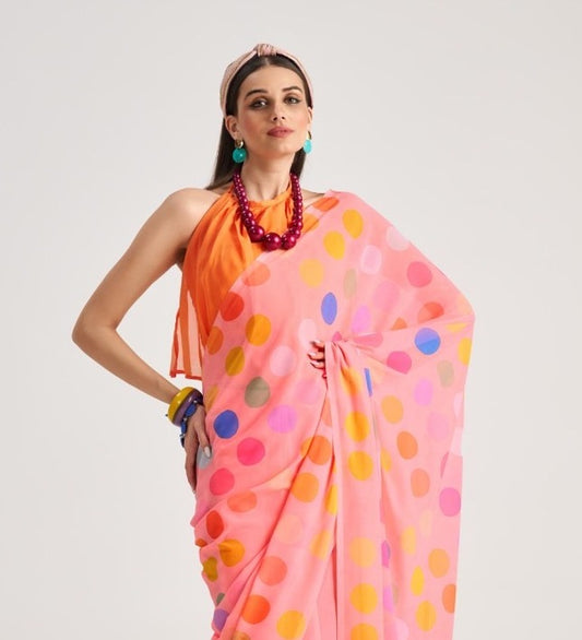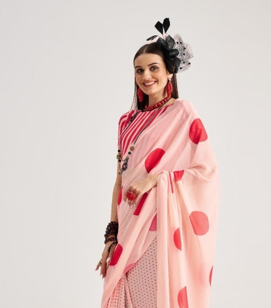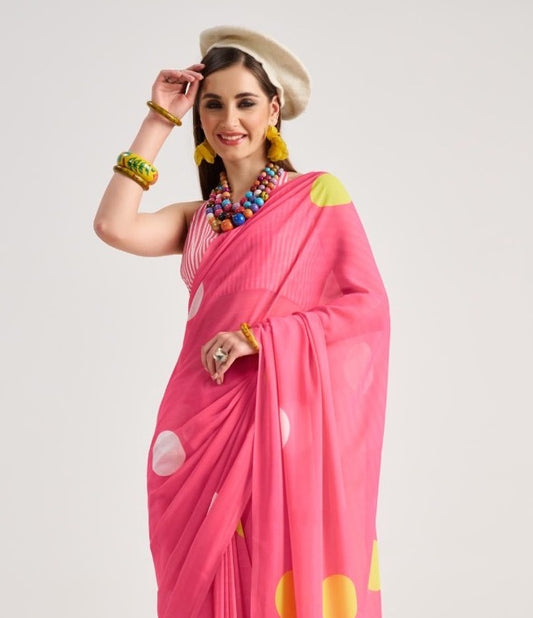 Pink Polka Dot Georgette Readymade/Easy Saree