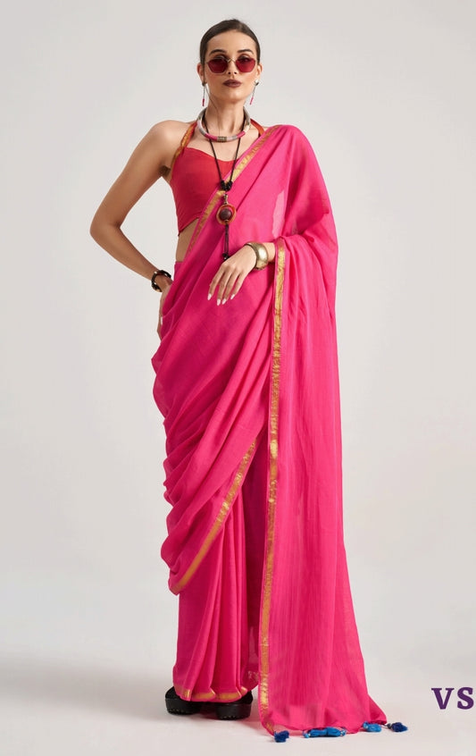 Pink Mul Cotton Casual Readymade/Easy Saree