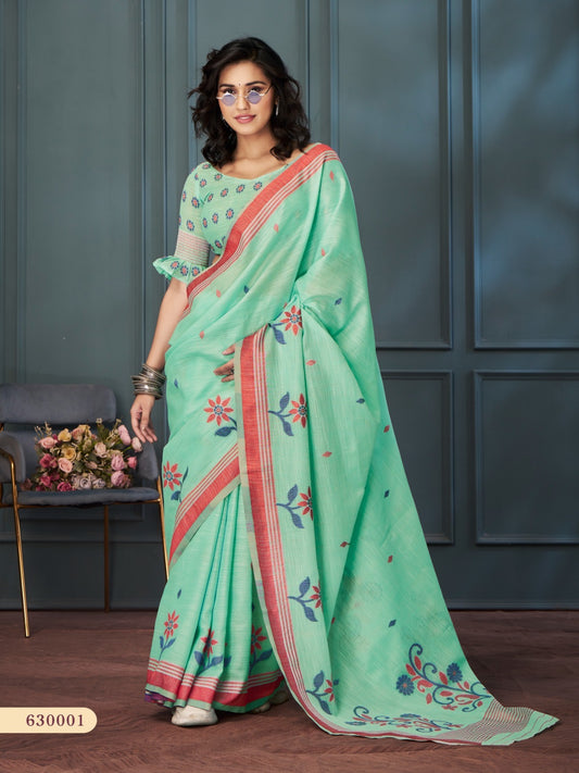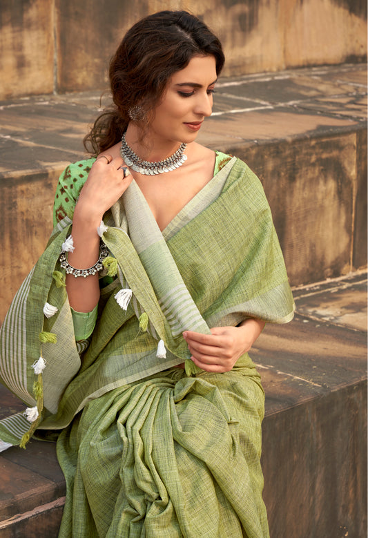 Green Linen Tissue Readymade/Easy Saree