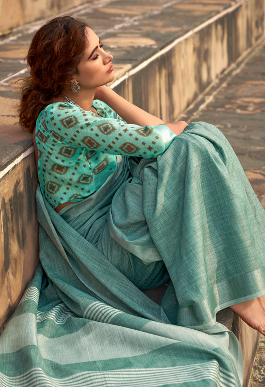 Turquoise Linen Office Wear Readymade/Easy Saree