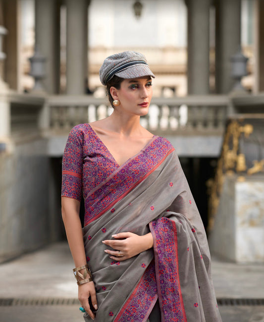 Grey Color Resham Woven Cotton Office Wear Easy/Readymade Saree