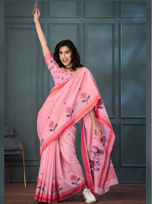 Pink Color Resham Woven Cotton Office Wear Easy/Readymade Saree