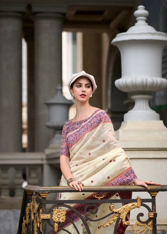 Off White Color Resham Woven Linen Cotton Easy/Readymade Saree