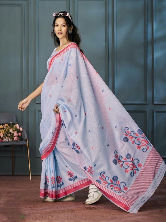 Powder Blue Color Resham Woven Cotton Office Wear Easy/Readymade Saree