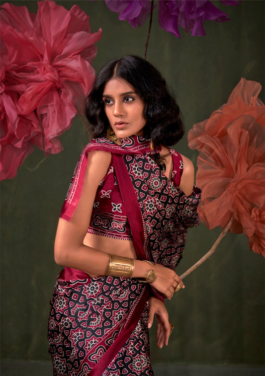 Maroon Crepe Calm ā Readymade Ajrakh Saree
