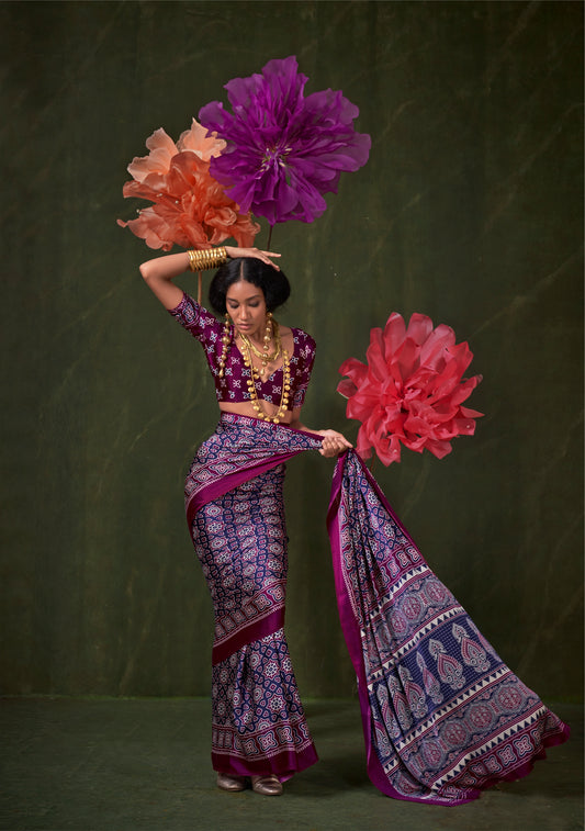 Purple Crepe Calm ā Readymade Ajrakh Saree