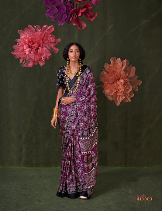 Purple & Black Crepe Calm ā Readymade Ajrakh Saree