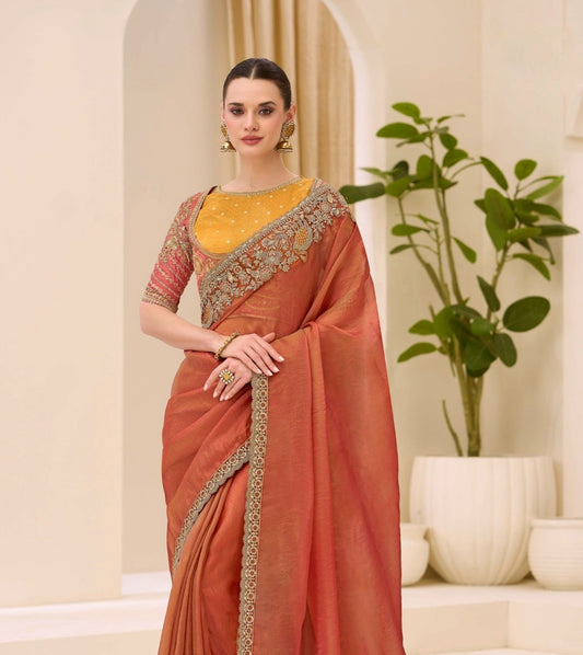 Rust Orange Cocktail Party Wear Readymade Saree