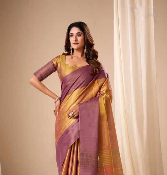 Dual tone Golden wine Plain Tissue Silk Readymade/Easy Saree