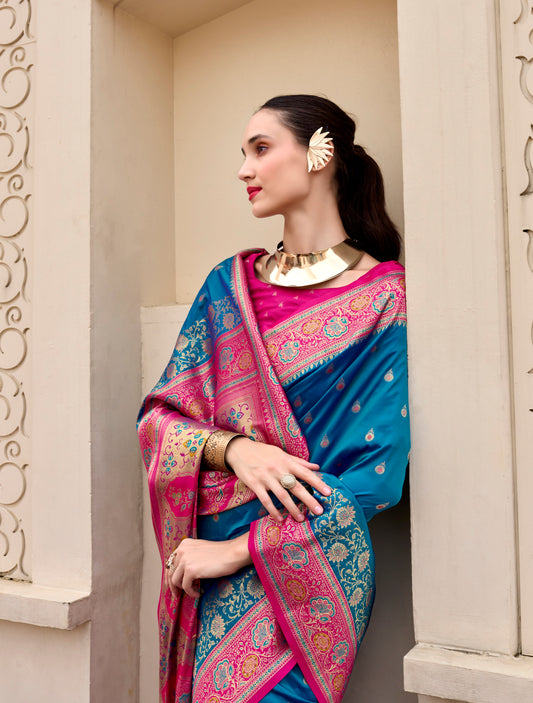 Teal blue Banarasi Silk Readymade/Easy Saree
