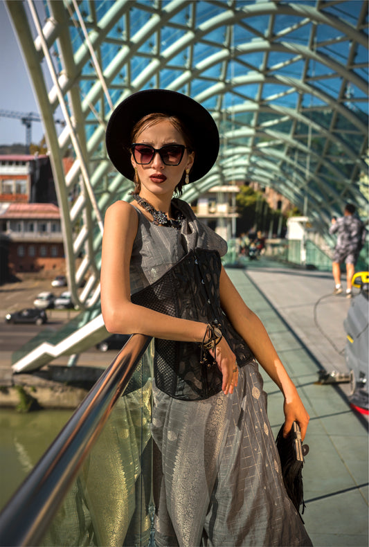 Grey Color Silk Readymade/Easy Saree With Fancy Unstitched Blouse