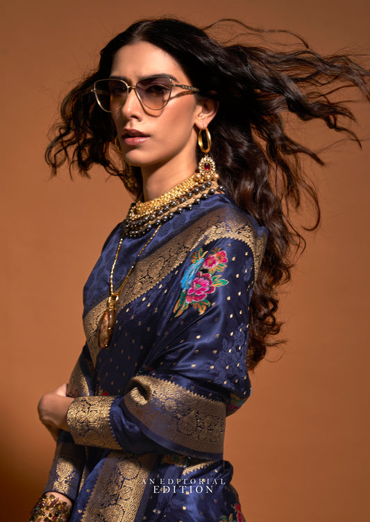 Navy Blue Color Satin Silk Readymade/Easy Saree