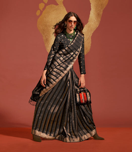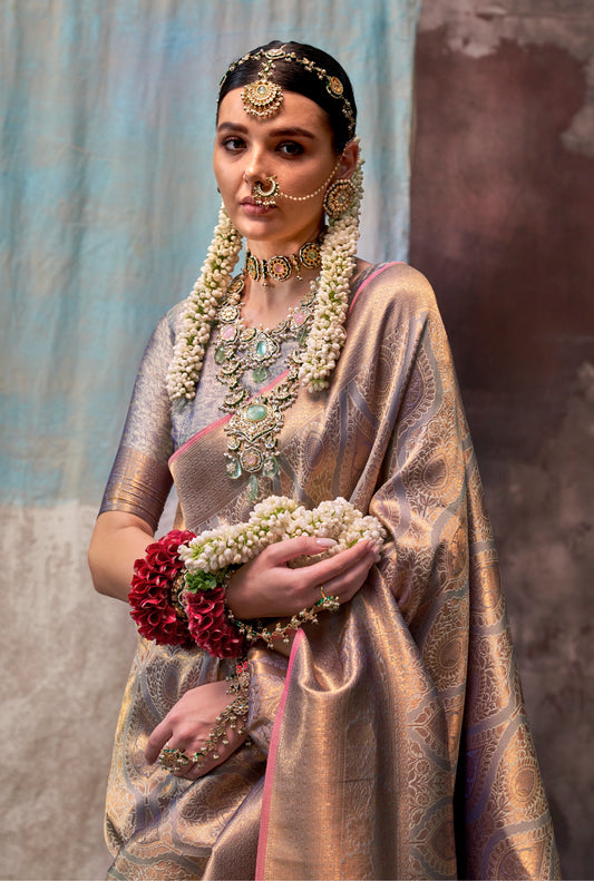 Grey & Golden Kanjivaram Silk Readymade/Easy Saree