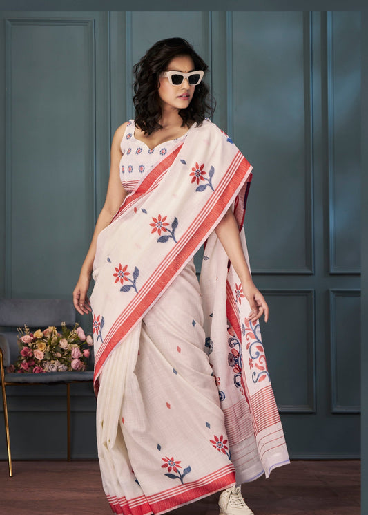 Off White Resham Woven Linen Cotton Easy/Readymade Saree