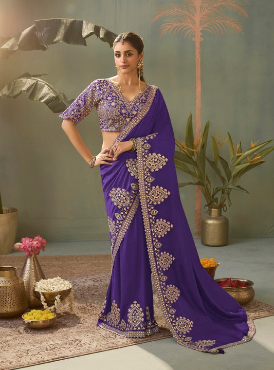 Royal Blue Embroidery Silk Readymade/Easy Saree
