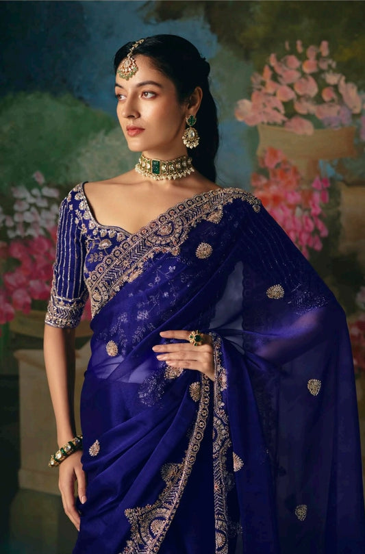 • Royal Blue Embroidery Silk Readymade/Easy Saree