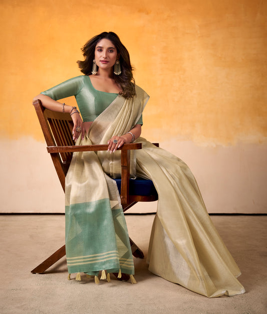 Sage green Linen Tissue Readymade/Easy Saree