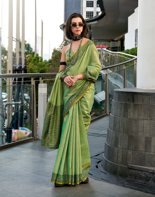 Green Linen Tissue Readymade/Easy Saree