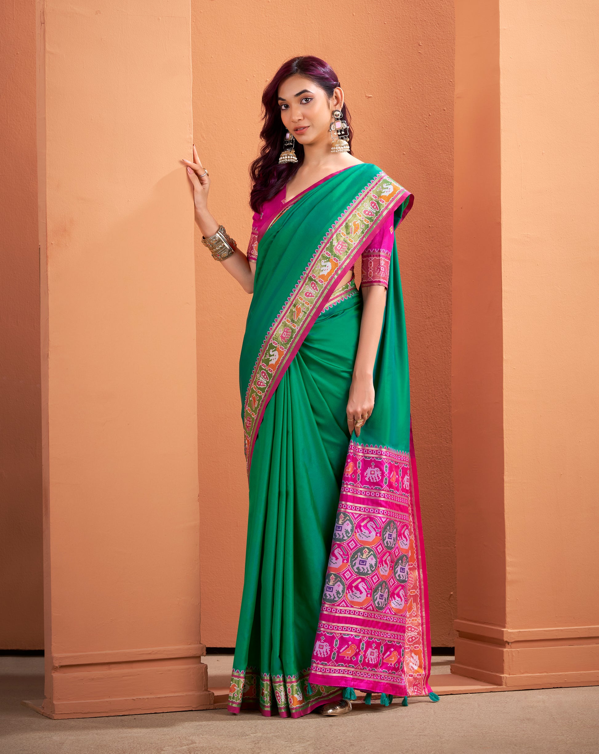 The unstitched blouse piece allows for personalization, with stitching available at an extra cost. For waist sizes above 44 inches, the blouse piece is excluded to provide extra pleats for the perfect drape. The unstitched pallu offers versatile stylingāwear it open or pleated.