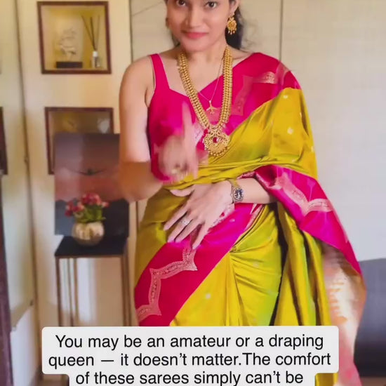 Designed for comfort and style, our custom-made sarees feature pre-pleated pleats and a skirt-like drape, letting you wear them effortlessly in just 18 seconds. Each saree comes with an attached petticoat for complete convenience.