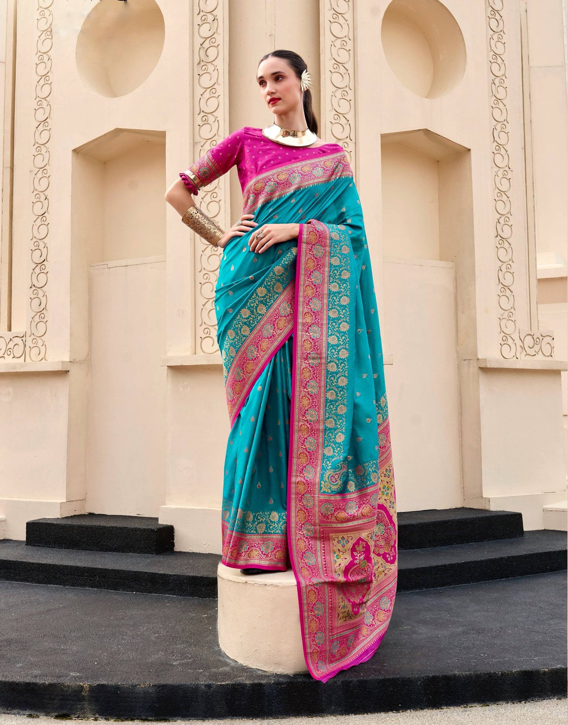 Teal blue Banarasi Silk Readymade/Easy Saree